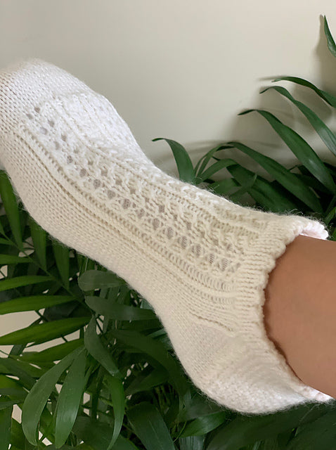Fin på tå er delikate, finstrikkede ankelsokker som kombinerer eleganse med komfort. Det dekorative mønsteret gir sokkene et lett og feminint uttrykk, perfekt både til hverdags og når du vil føle deg litt ekstra fin.